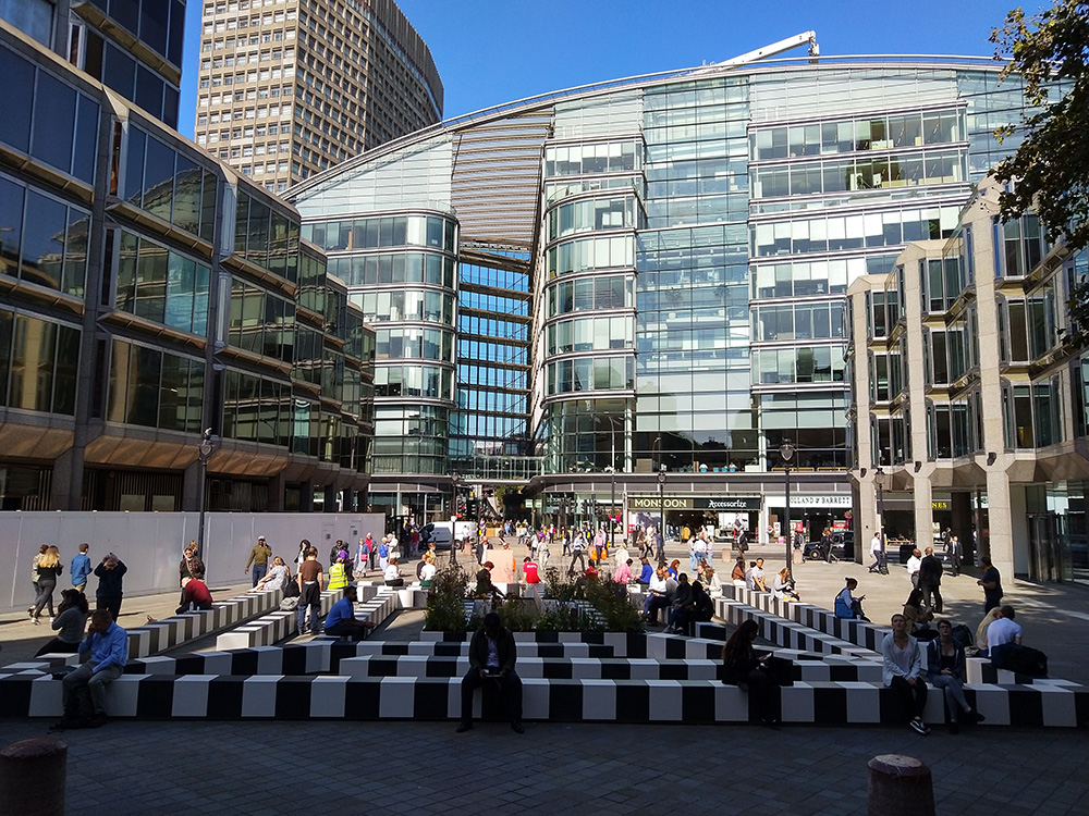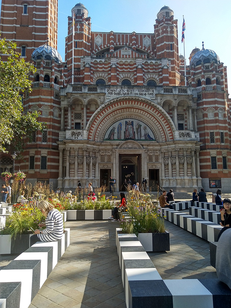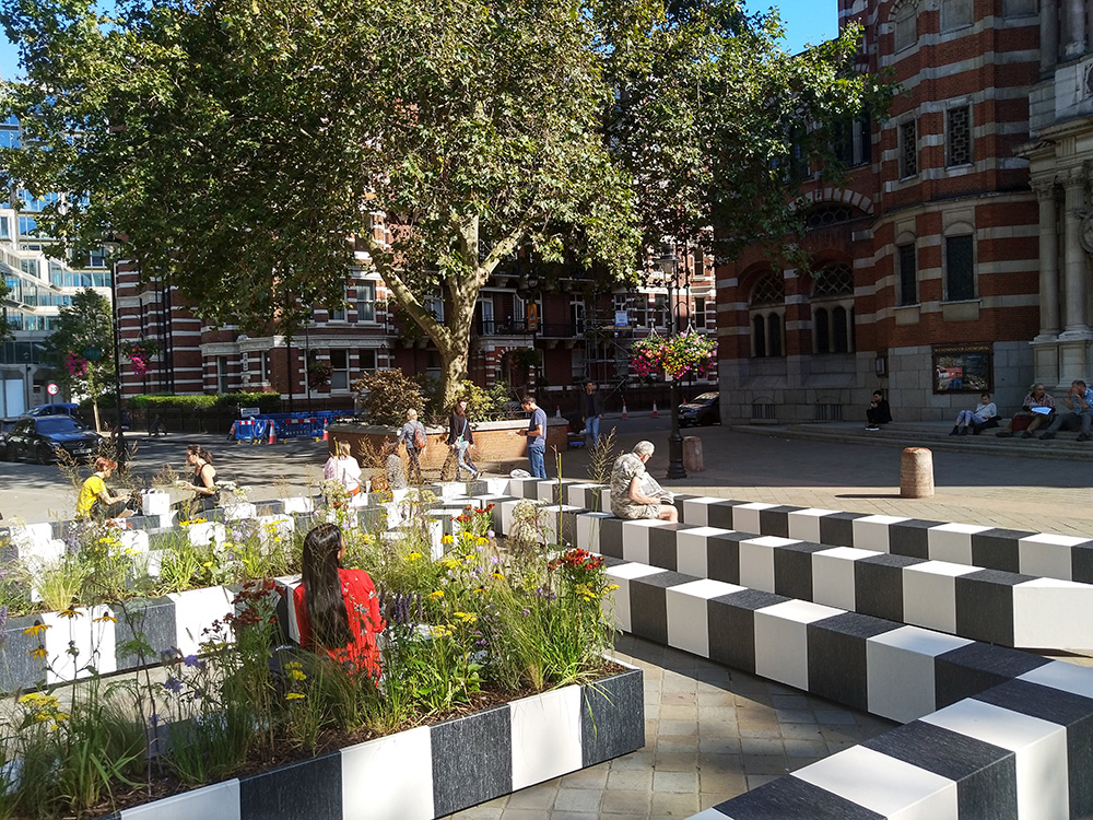 Place in front of Westminster Cathedral it feels appropriate outside because these monochrome blocks referencing the stripes of the red and white exterior of Cathedral. Also they found an unusual link during their research, discovering that there used to be a maze in the same space during the Victorian era.