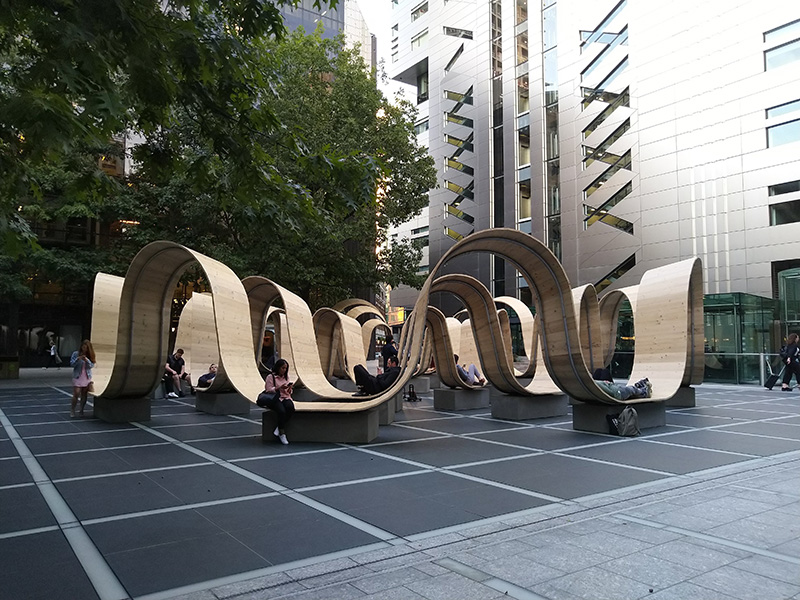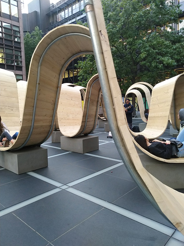 This huge bench is walks the line between a craft object and a design solution, however it occupies the square without blocking it.