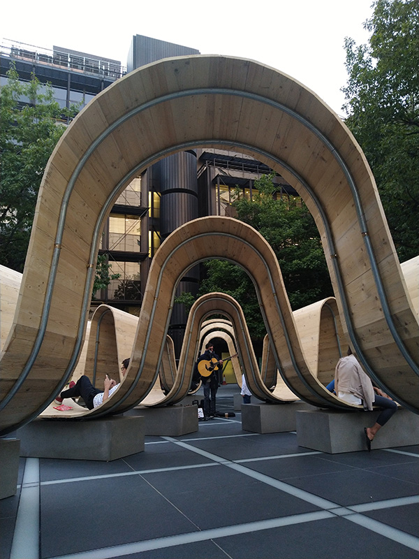 Made from old scaffolding planks, the aim that the designer wanted to communicate with every single aspect of the installation that is tailored to its environment as well as the function it serves is easy, just please to be seated – indeed the curves raise up to create backrests and places to sit, as well as space for people to walk under, or pause and find some shade.