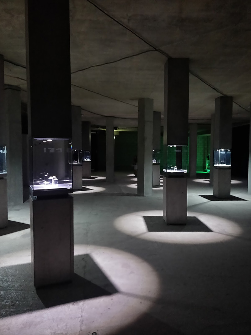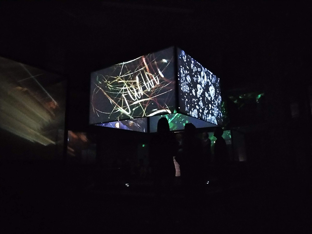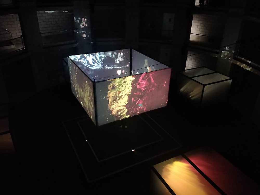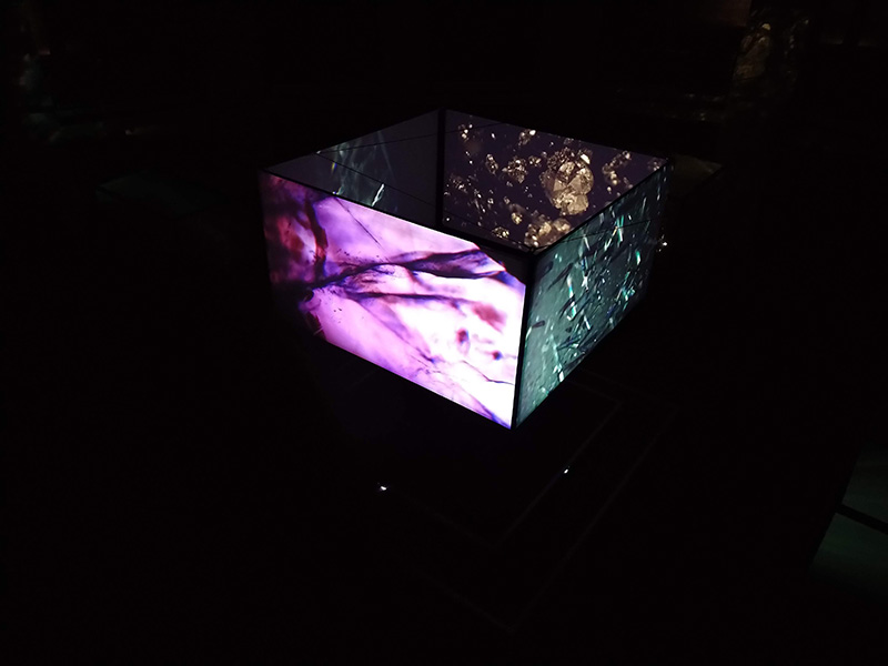 However, I think special mention needs to go to the presentation of the work. Before to get to the installation you have to walking through with the actual gems themselves, displayed in small cabinets, accompanied by placards outlining all sorts of information about them and in the meantime, intrigued by sound the chorus of female voices, you continue to follow the lights until to reach the center of the building where you can see this installation displaying the film through the 360-degree screen.